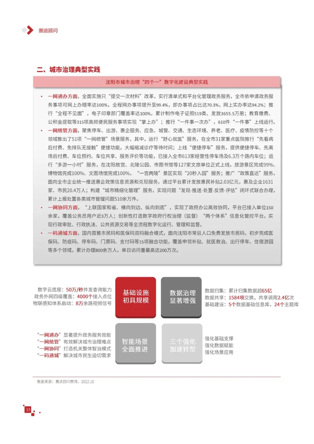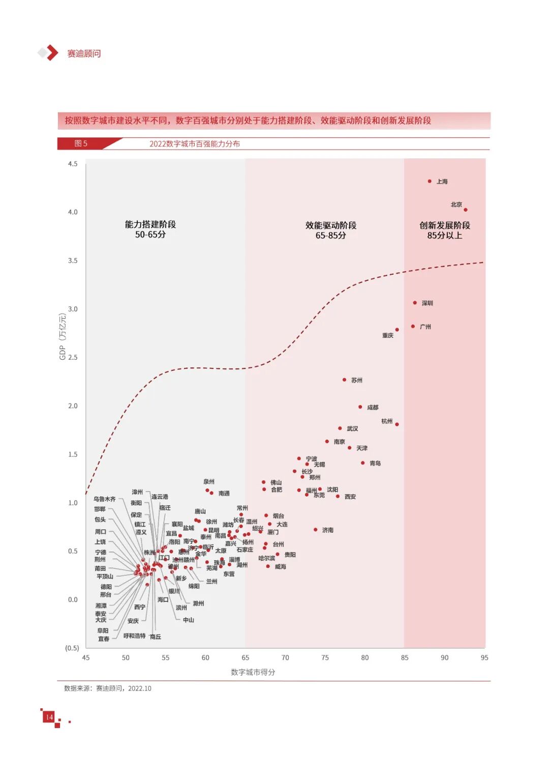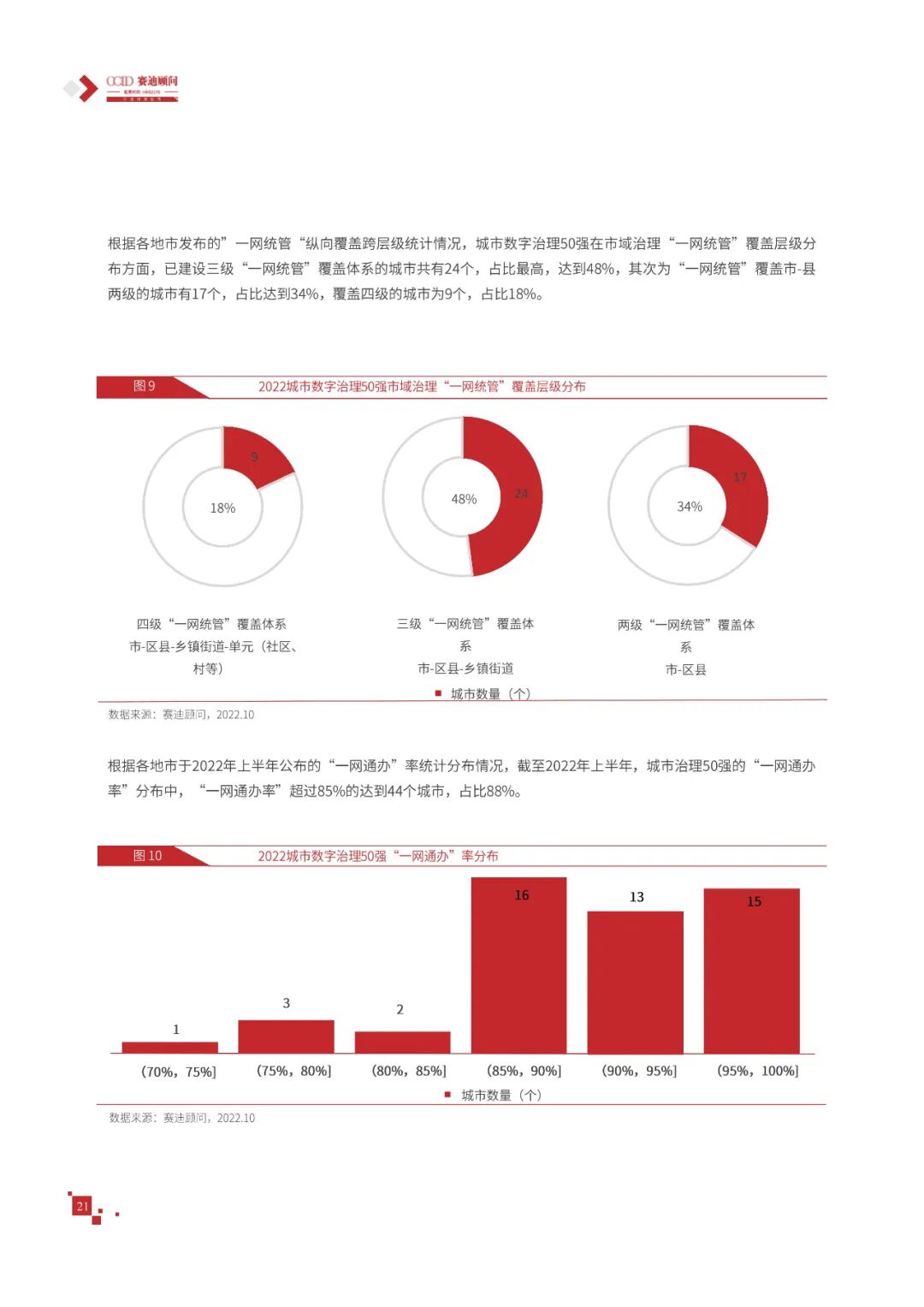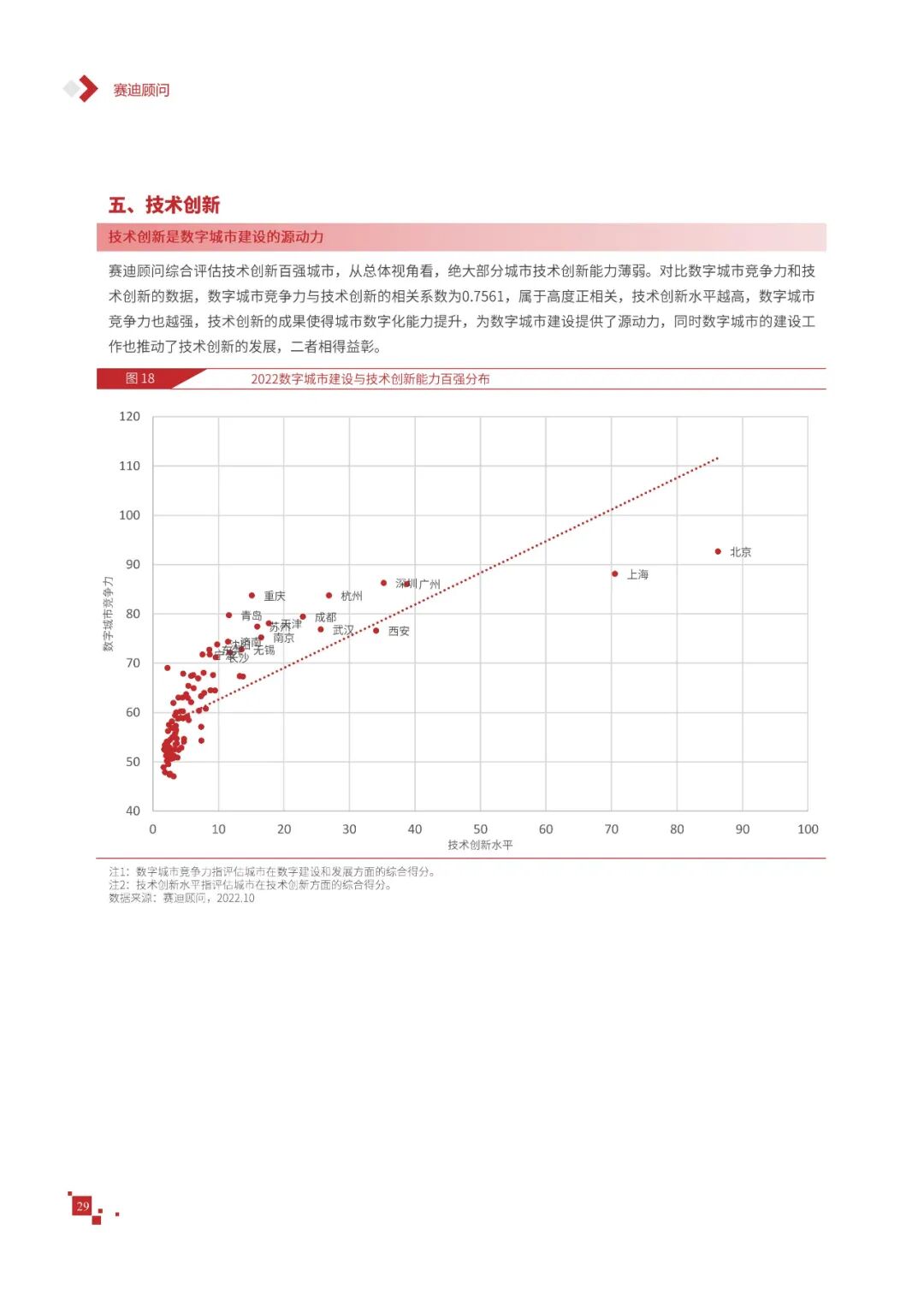 数字城市的建设旨在通过数字化技术为社会治理、公共服务等领域赋能,提升城市建设效率、改善城市运行形态,以促进城市理念升级、效能变革。为深入推动城市数字化、智慧化发展,树立优秀的城市作为标杆,2022年中国数字城市百强研究从信息基础、城市治理、产业经济、民生服务、技术创新、低碳发展等六个方面,全面评估中国数字城市竞争力,剖析数字城市建设路径和方法,为深化中国数字城市高质量发展奠定基础。报告主要由四个部分组成,第一部分为数字城市建设新时期的背景和机遇;第二部分为全国数字城市竞争力评价的指标体系、百强榜单和百强城市特征分析;第三部分为数字城市能力解码,从信息基础、城市治理、民生服务、技术创新、低碳发展等方面分别阐述了城市各领域数字化水平;第四部分为数字城市建设典型实践,挑选各领域建设的典型城市进行案例分析。报告内容如下