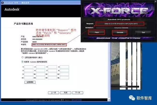 14.在注册机界面中,把申请号复制到注册机程序界面上的REQUEST输入框中,然后分别点击“PATCH”和GENERATE按钮,得到激活码(提示:复制和粘贴只能用快捷键“Ctrl+C”和“Ctrl+V”)