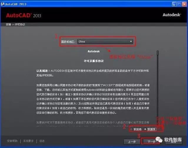 4.许可协议界面,先在国家或地区中选择“China”,勾选“我同意”,然后点击【下一步】