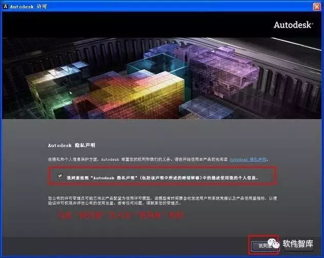 10.勾选“我同意按照 Autodesk隐私声明……”,然后点击【我同意】