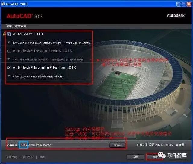 6.关于第二项“Autodesk Design Review 2013”最好不要选择,否则有可能导致最后安装失败,点击【浏览】可更改软件安装路径:建议安装到除C盘以外的磁盘,可在D盘或其它盘里面新建一个文件夹CAD2013,该文件夹名称请勿包含中文名称!(小白建议直接把安装路径中“C”改成“D”(篮框标记处)),然后点击【安装】