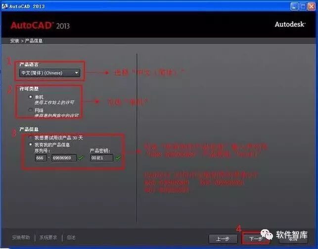 5.在产品信息界面中,产品语言选择“中文简体”,许可类型选择“单机”,产品信息勾选“我有我的产品信息”,输入序列号(序列号:666-69696969、066-66666666和667-98989898,这三任选其一)和产品密匙(密钥:001E1),然后点击【下一步】