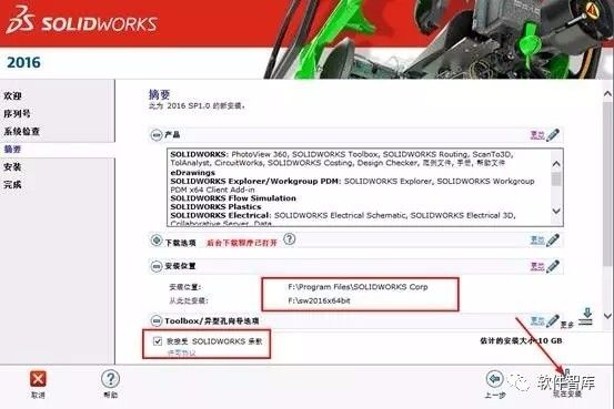 7.首先点击安装位置右侧的【更改】,用户可以自定义软件安装的路径,小编这里选择安装到F盘;然后勾选“我接受SOLIDWORSKS条款”,点击【现在安装】