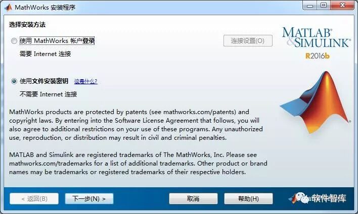 3.稍等一会儿,弹出MathWorks安装程序界面,先勾选“使用文件安装密钥 不需要Internet连接”,然后点击【下一步】
