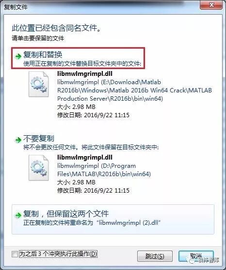 18.之后依次打开文件夹D:\ProgramFiles\MATLAB\R2016b\bin\win64文件,将刚才复制的dll文件粘贴在这个文件夹中,系统会提示“复制文件”对话框,所有文件都选择“复制和替换”即可。