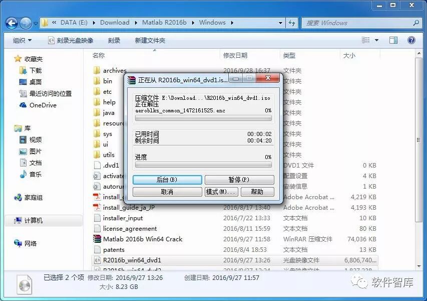 1.使用“百度网盘客户端”下载Matlab 2016b安装包和Crack破解文件,解压安装文件,安装文件为iso格式,但是不能通过虚拟光驱安装,需要将iso文件用解压软件解压。注意,R2016b_win64_dvd1.iso和R2016b_win64_dvd2.iso两个文件均需要解压,且必须解压到同一个文件夹,如下图所示:
