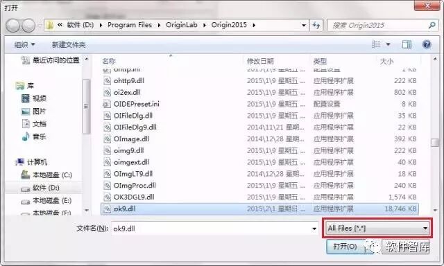 17.将文件选项改为“AllFiles*.*”,浏览找到安装目录内的文件“ok9.dll”(64位系统为“ok9_64.dll”),点击“打开”即可破解。