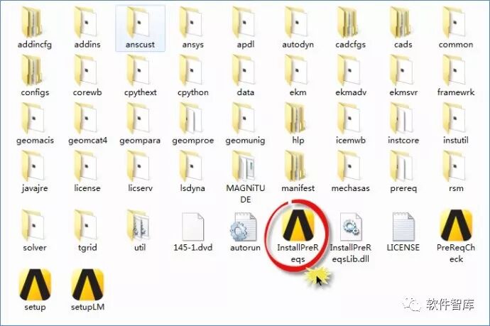 1.根据自己电脑操作系统的位数使用“百度网盘客户端”下载ANSYS 14.5.7软件安装包和破解文件到电脑磁盘里,请勿解压,使用虚拟光驱加载disk1。文件夹中内容如下图所示,鼠标双击InstallPreReqs.exe文件进行必要程序安装