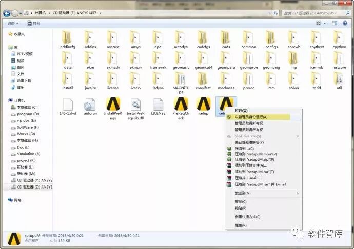 3.鼠标双击setup.exe文件,进入ANSYS安装过程。注意:若为Win7系统,为避免不必要的麻烦,鼠标右击选择【以管理员身份运行】