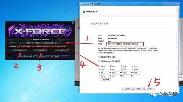15.这一步非常重要!将产品可激活选项界面中的“申请号”的内容复制到注册机“Request”框内,单击【patch】,再点击【Generate】生成激活码,将生成的“Activation”内激活码复制粘到注册界面的激活码输入框中,然后点击【下一步】(提示:复制和粘贴只能用快捷键“Ctrl+C”和“Ctrl+V”)