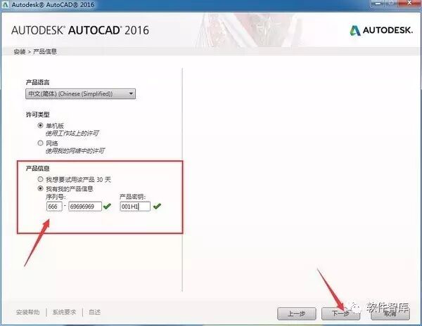 6.勾选“单机版”,在产品信息中勾选“我有我的产品信息”,输入序列号:666-69696969和产品密钥:001H1,然后点击【下一步】