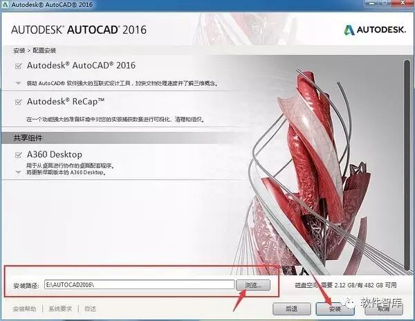 7.首先勾选安装选项,点击【浏览】可更改软件的安装路径,例如小编安装在了E盘,名称为AUTOCAD2016文件夹内(小白建议直接将安装路径中的C改为D),然后点击【安装】开始安装主程序