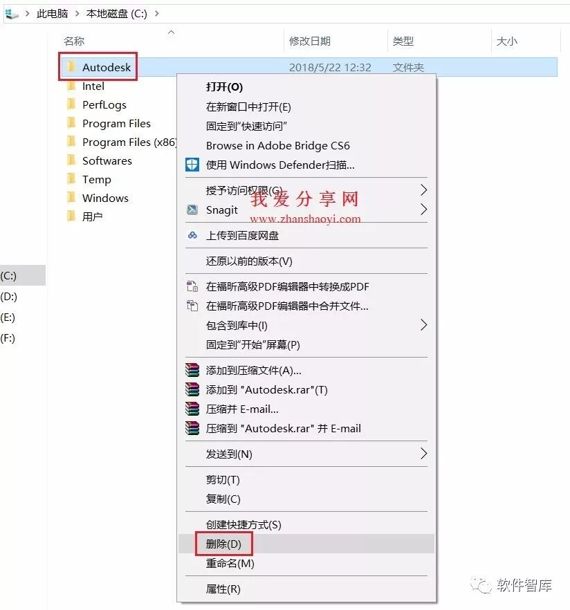 28.打开C盘,找到根目录下(对应第2步的位置)名为Autodesk文件夹,鼠标右击选择【删除】即可