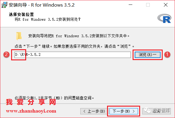 4.选择软件安装路径,默认安装在C盘,点击【浏览】可更改安装路径,注意:安装路径文件夹名称不能含有中文字符!小编这里将软件安装在D盘R文件夹下,然后点击【下一步】