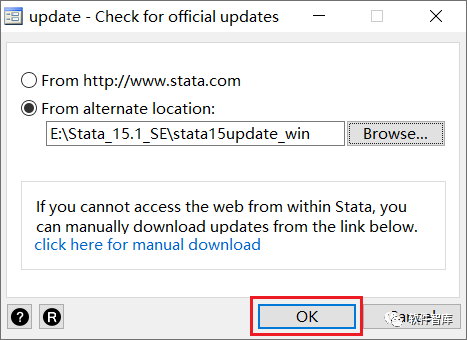 18.弹出update窗口,先勾选“Fromalternate location:”选项,然后点击【Browse】按钮,找到软件初始安装包内的stata15update_win文件夹,单击选中后点击【确定】