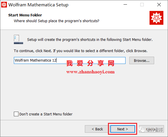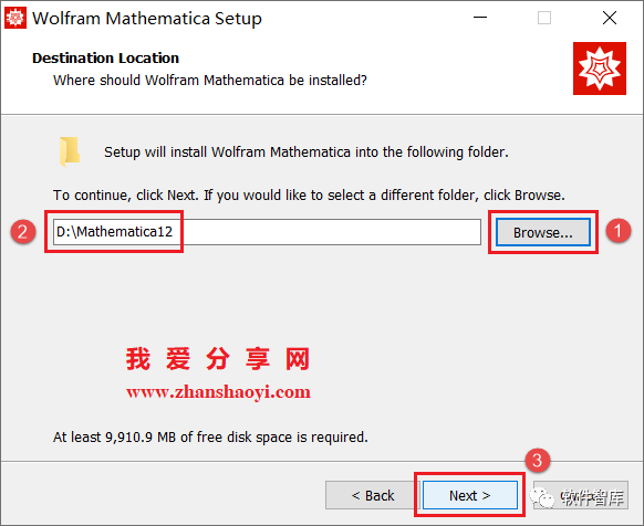 4.选择软件安装路径,默认安装在C盘,点击【Browse】可修改软件安装路径,注意:安装路径文件夹名称不能含有中文字符!小编这里将软件安装在D盘Mathematica12文件夹下(须提前在D盘新建名为Mathematica12的文件夹),然后点击【Next】