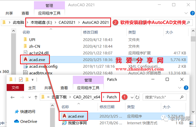 11.找到acad.exe,将其复制粘贴到软件安装目录(见第7步)中AutoCAD2021文件夹下替换原文件