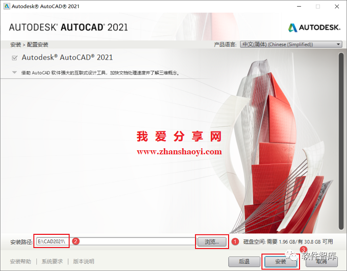 6.选择软件安装路径,默认安装在C盘,点击【浏览】可更改软件安装路径,注意:安装路径文件夹名称不能出现中文字符!小编这里将安装在E盘CAD2020文件夹下,然后点击【安装】