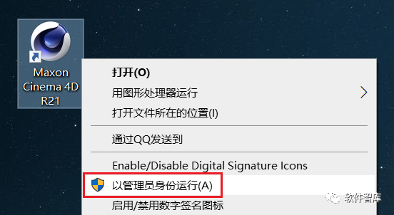 11.找到上一步生成的C4DR21图标,鼠标右击选择【以管理员身份运行】
