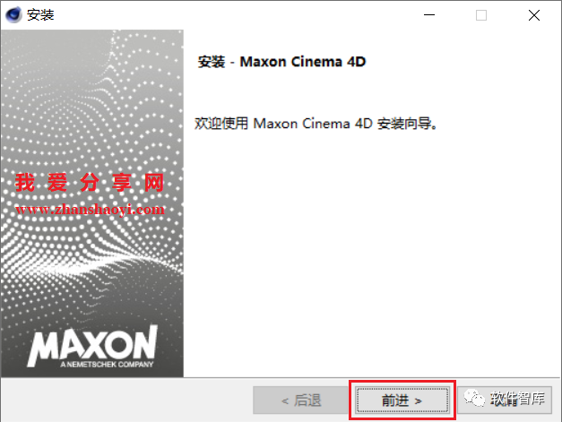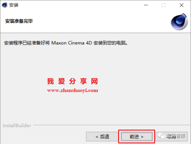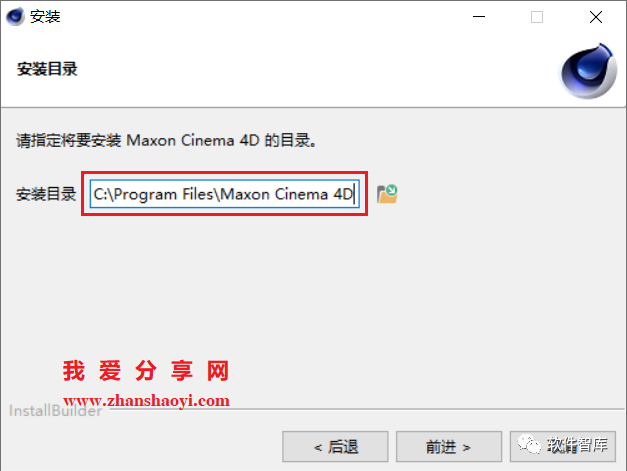 3.选择软件安装路径,默认安装在C盘,点击【文件夹图标】可修改软件安装路径,注意:安装路径文件夹名称不能含有中文字符!小编这里将软件安装在D盘C4DR21文件夹下,然后点击【前进】