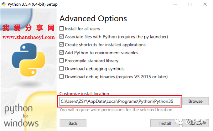 4.选择软件安装位置,默认安装在C盘,点击【Browse】可更改软件的安装目录,注意:安装路径文件夹名称均不能含有中文字符!小编这里将软件安装在D盘Python3.5.4文件夹下,然后点击【Install】