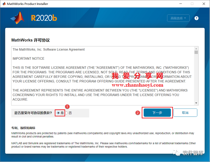 5.许可协议界面,先勾选“是”,然后点击【下一步】