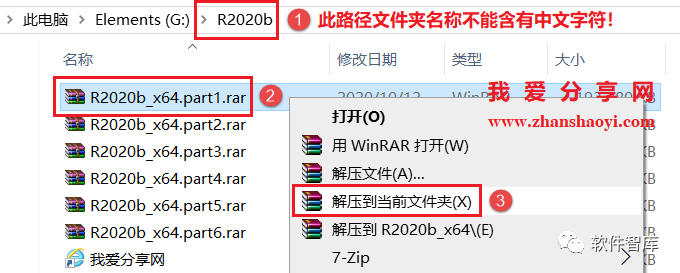 温馨提示:安装包有6个.7z格式的压缩包(大小共20G),均下载完成后才可以正常进行解压,找到R2020b_x64.part1.rar,鼠标右击选择【解压到当前文件夹】,耐心等待解压完成即可,Part2~6自动同步进行解压,无需再单独解压。