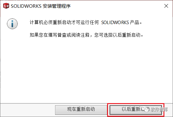 26.点击【以后重新启动】,暂不重启电脑