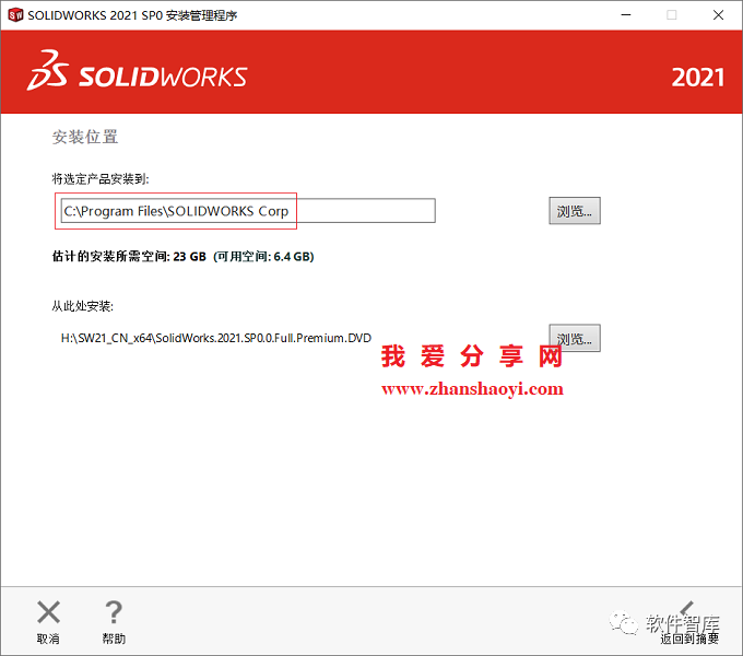 19.选择软件安装路径,默认安装在C盘,建议点击【浏览】修改软件安装路径,软件安装完成后会占用磁盘空间20.3G,注意:安装路径文件夹名称均不能含有中文字符!小编这里将软件安装在D盘SW2021文件夹下,然后点击【返回到摘要】