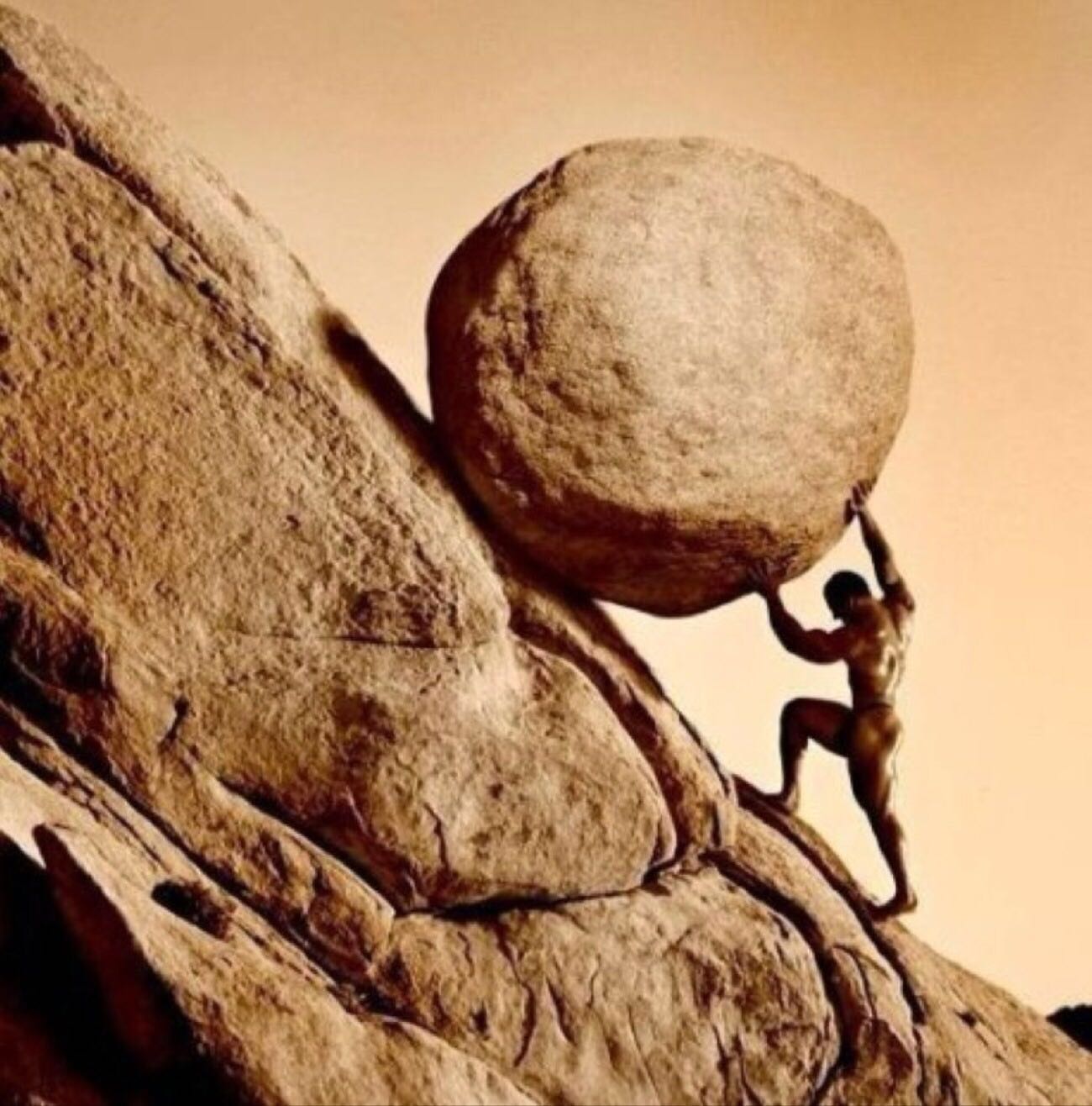 在古希腊神话中,西西弗得罪了诸神,诸神罚他将巨石推到山顶。然而,每当他用尽全力,将巨石推近山顶时,巨石就会从他的手中滑落,滚到山底。西西弗只好走下去,重新将巨石向山顶奋力推去,日复一日,陷入了永无止息的苦役之中。法国作家加缪从这则著名的古希腊神话中,发现了人类现实困境的某种象征意义,于是写成了阐述他荒谬英雄理念的名篇《西西弗的神话》。