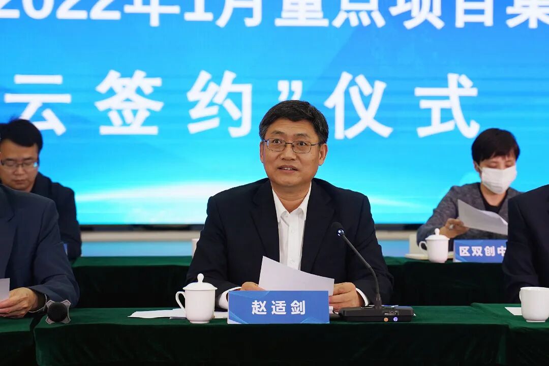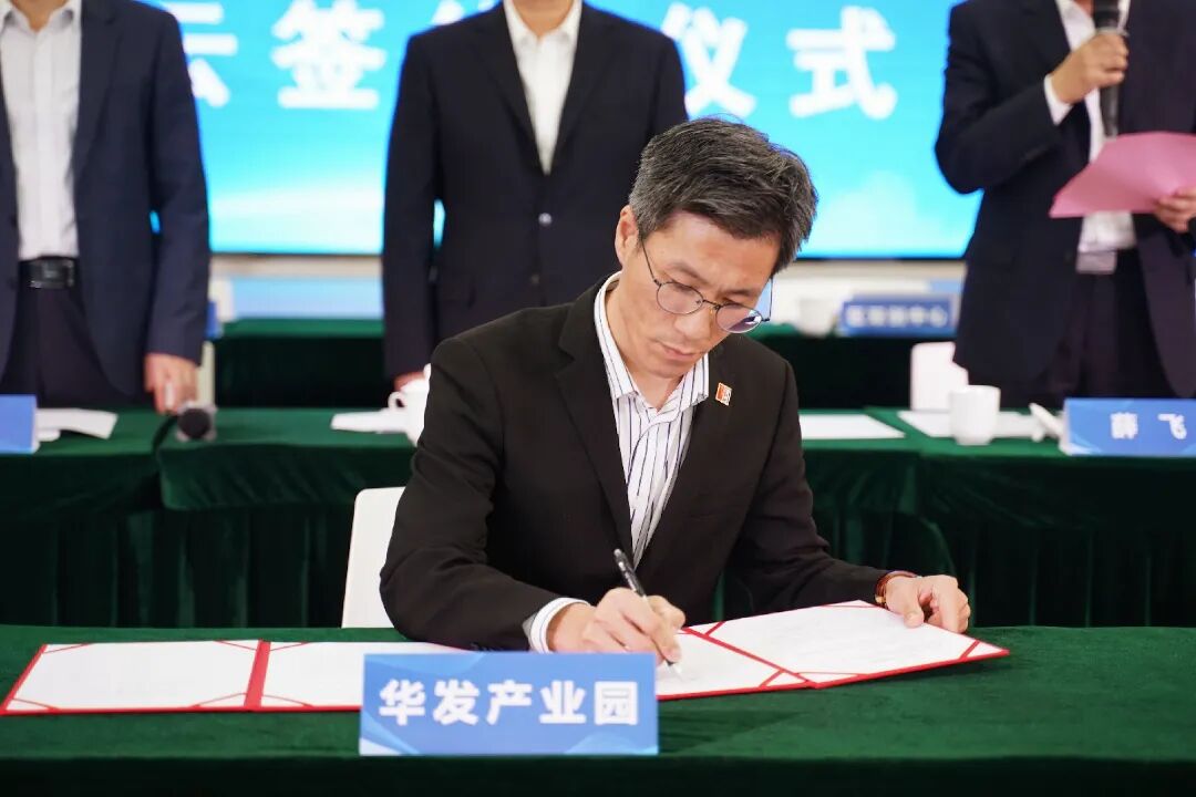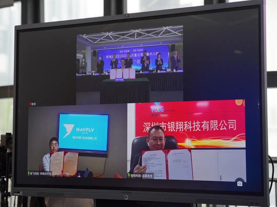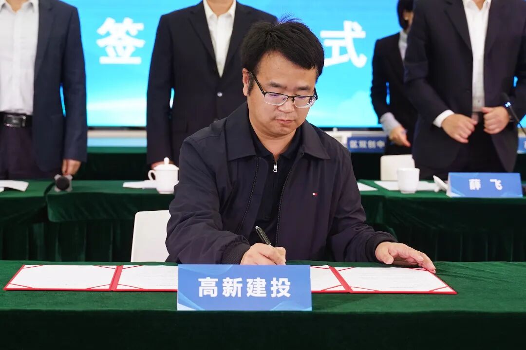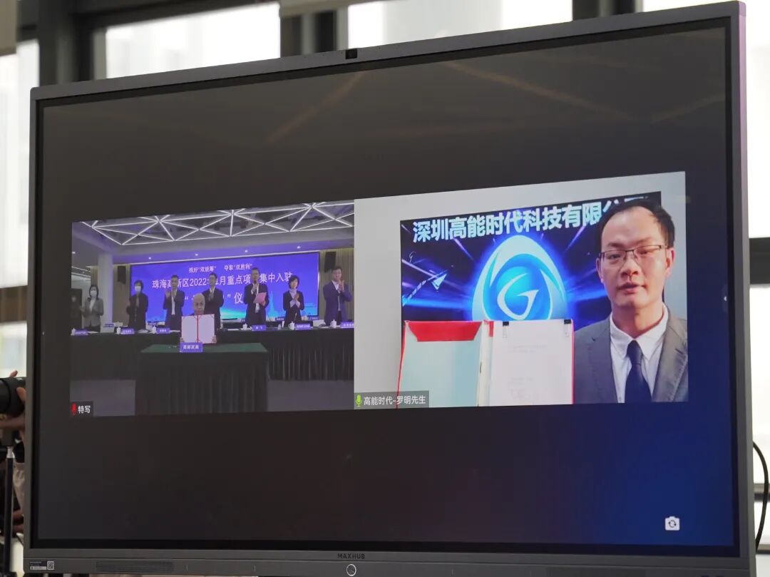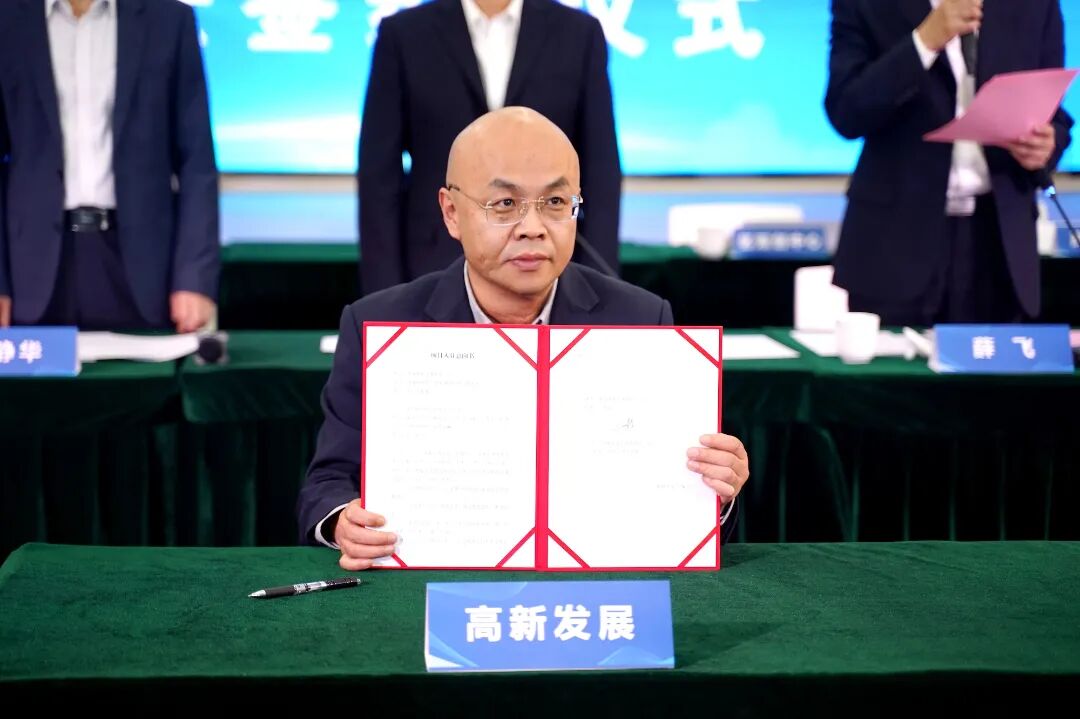 在高新区党工委书记赵适剑,高新区党工委委员、区管委会副主任薛飞,高新区二级调研员张静华等的见证下,华灿光电半导体、广东若贝特智能机器人扩产、深圳蜉飞大型物流无人机、深圳银翔科技警用装备制造、深圳高能时代全固态锂电池研产基地、珠海优微可溶性微针创新制剂CDMO平台一期等6个项目的负责人,分别与4家入驻载体负责人签约,并向镜头展示签约文本。