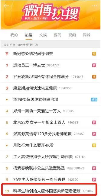 此次唐伟国的去世在网上引起了轩然大波,12月26日下午连续数小时这个话题挂在微博热搜。作为医药上市公司的创始人,仍死于新冠,无尽唏嘘。