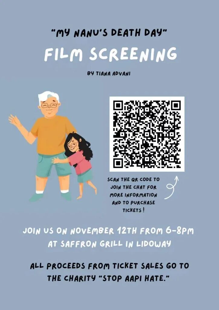 Based on a true story, short film My Nanu’s Death Day follows a young girl as she finds out an Indian psychic has predicted her grandfather will die that day.The screening will be followed by an open mic storytelling opportunity, a celebration of family, Indian food and more, with all proceeds from ticket sales to be donated to charity Stop AAPI Hate.Tickets are RMB300, and include an Indian street food dinner and three drinks. Scan the QR code on the poster above to purchase yours now.Saturday Nov 12, 6-8pm; RMB300.Saffron GrillLidoway, 1410 Xiewei Lu, by Huqingping Gong Lu 谢卫路1410号,近沪⻘平公路.