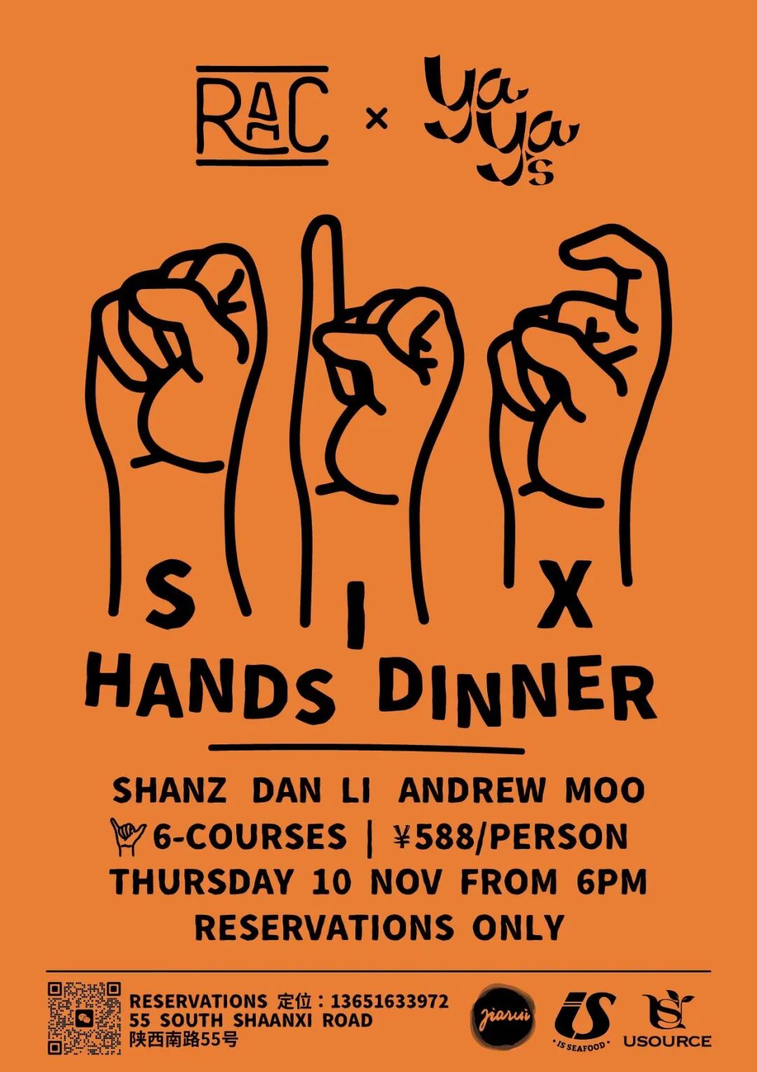It's all six hands on deck as RAC and Yaya's host a Six Hand Dinner this Thursday, with a six-course menu from superstar chefs Shanz, Dan Li and Andrew Moo priced at just RMB588.RAC55 Shaanxi Nan Lu, by Huaihai Zhong Lu 陕西南路55号, 近淮海中路.