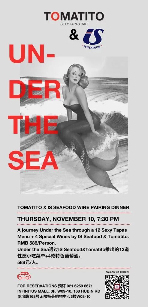 Tomatito is hosting an Under the Sea wine pairing dinner with IS Seafood, featuring 12 tapas plus four special wines, and all for just RMB588.Thu Nov 10, 7.30pm; RMB588.TomatitoInfinitus Mall, 3/F Room W08-10, 168 Hubin Lu, by Jinan Lu 湖滨路168号3楼W08-10,近济南路.