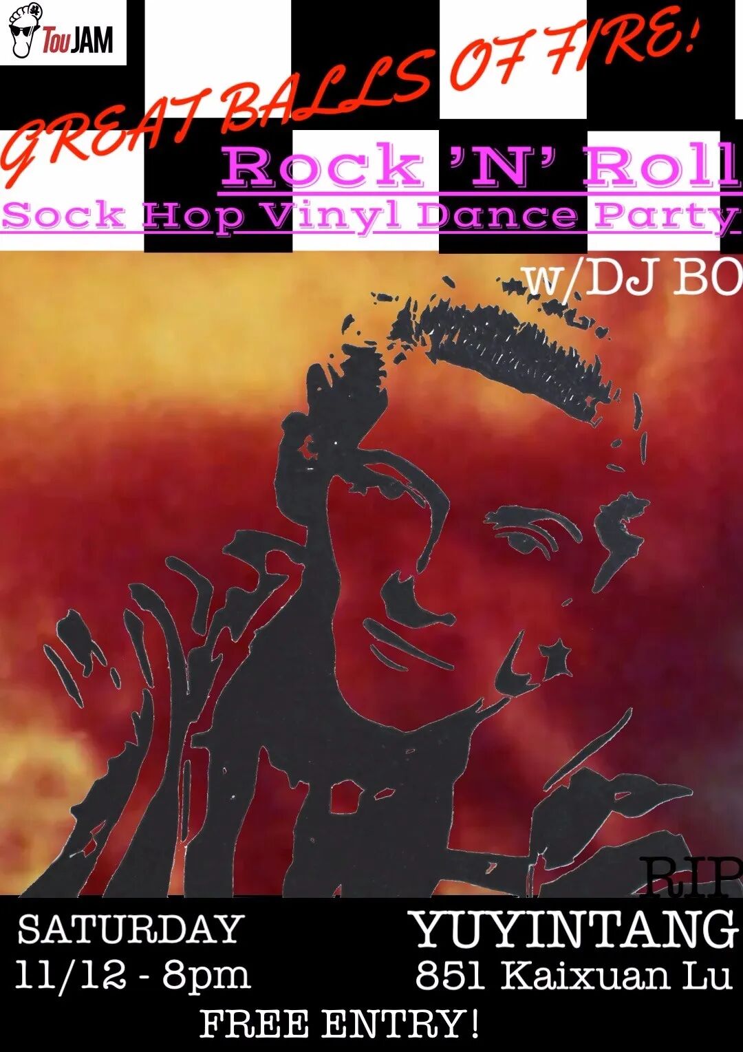 DJ BO – 'Shanghai's #2 DJ' – will be throwing an old fashioned sock hop! What's a sock hop? Just a cool name for a 1950s-music dance party, from doo-wop, to rockabilly, to early surf, and all the other sounds that defined the early days of rock 'n' roll.This one will be in tribute to Jerry Lee Lewis, the Killer, who recently passed away. Whether a hardcore head of all the obscure 1950s B-Sides, or not familiar at all, you'll find something you can dig at Great Balls Of Fire! This Saturday at Yuyintang.Sat Nov 12, 8pm-Late; Free.Yuyintang851 Kaixuan Lu, by Yan'an Xi Lu 凯旋路851号,近延安西路口.