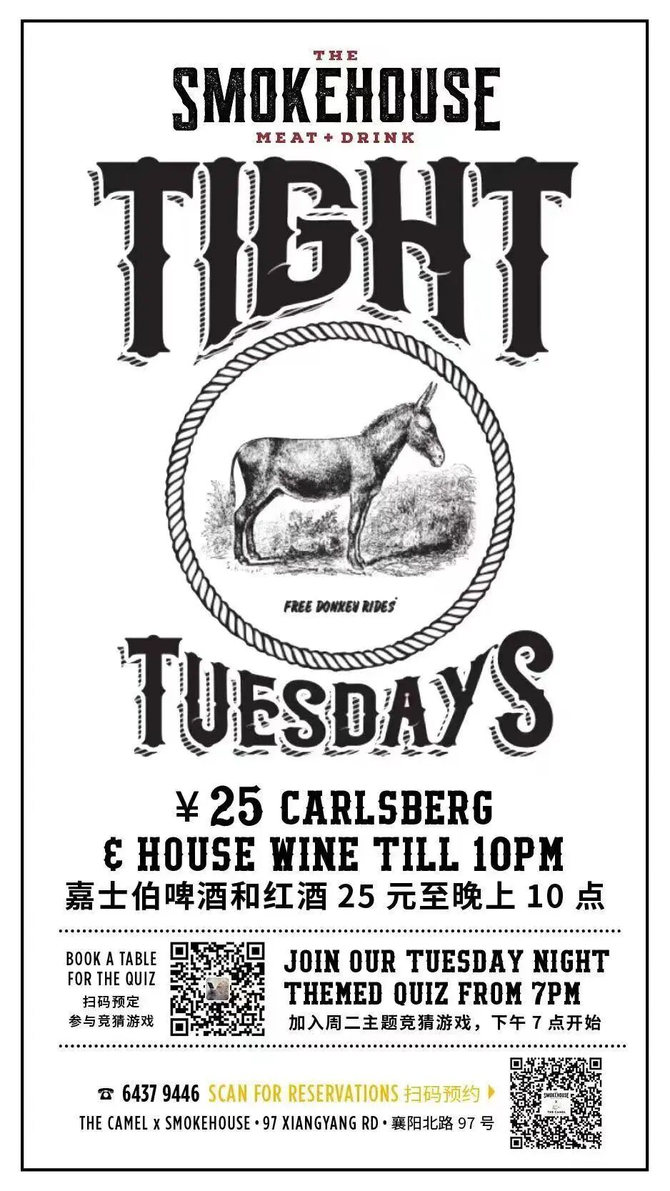 Every Tuesday The Smokehouse it just RMB25 for Carlsberg and House Wine, plus they throw in a themed quiz each week absolutely free! Scan the QR on the poster above to sign up now.Wednesday