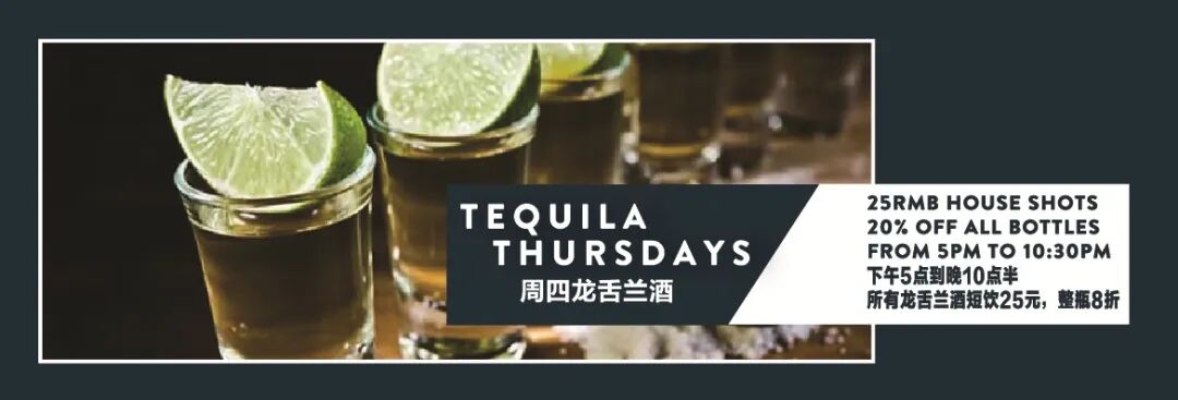 It is 20% off tequila bottles and RMB25 a tequila shot every Thursday at Cantina Agave.Friday