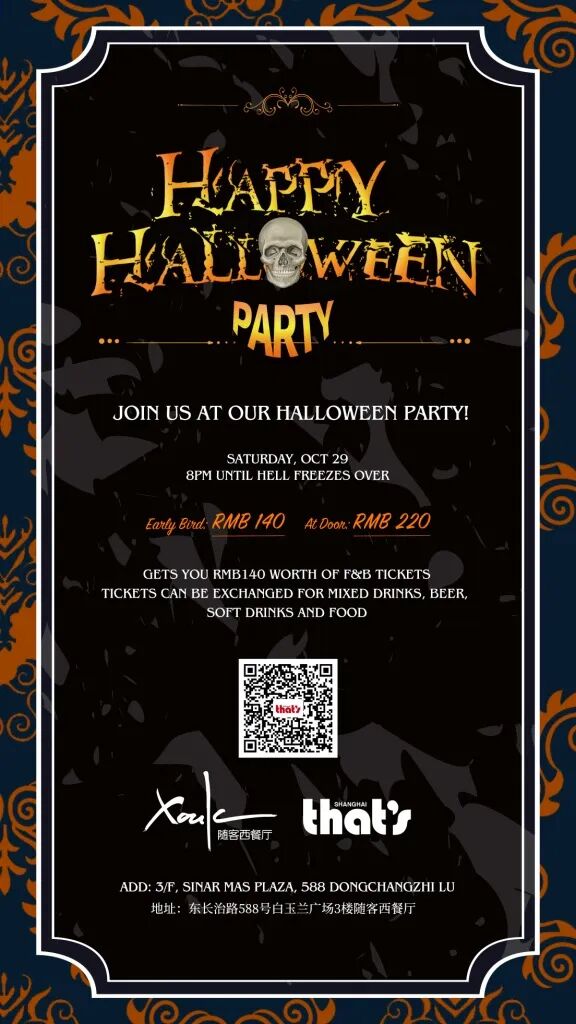 So gather your squad together and enjoy great discounts. Each ticket includes entry to all of the above freaky fun and five F&B tickets, which can be exchanged for mixed drinks, beer, soft drinks and food. Last year, people rocked up in full costume, dancing on tables well into the wee hours of the morning to old school hip hop and classic tunes from throughout the decades, from the 80s all the way to 2020. Here's a video of how it all went down: Tickets will be RMB220 at the door, so buy now to avoid disappointment. Get yours by scanning the QR: Saturday Oct 29, 8pm until hell freezes over. Xouk3/F, Sinar Mas Plaza, 588 Dongchangzhi Lu, by Xinjian Lu 东长治路588号白玉兰广场3楼, 近新建路