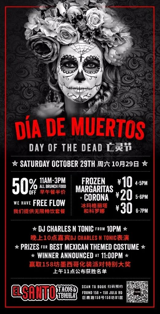 You can also celebrate Dia de los Muertos all day at El Santo in Found 158, with 50% off all brunch food items from 11am-3pm and then Coronas and Frozen Margaritas just RMB10 from 4-5pm, RMB20 from 5-6pm and RMB30 from 6-7pm. Dj Charles N Tonic will be playing from 10pm, with prizes for best costume will be announced at 11pm. Sat Oct 29, 11am-Late; Free. El SantoB/1, Found 158, 158 Julu Lu, by Ruijin Yi Lu 巨鹿路158号B1层, 近瑞金一路.