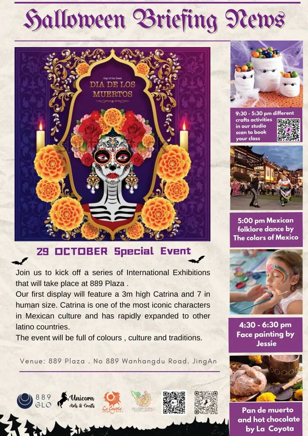 Celebrate the Mexican Dia de los Muertos – Day of the Dead – on October 29, with a three meter high Catrina, and seven human size Catrinas, being installed in the main entrance of 889 Plaza. Starting at 9.30am, the event will feature different Halloween crafty activities, traditional Mexican dance by The Colors of Mexico dancing company, face painting by Jessie and delicious pan de muerto and hot chocolate by La Coyota! Tickets are RMB68 early bird (before October 26), and RMB88 after, which includes pumpkin painting from 1.30-4.30om, access to the dance show, a photo opportunity with the Catrinas, face painting and a box woth candies for the children. Scan the QR on the poster above for more info and to book your classes. Sat Oct 29, 9.30am; RMB68 early bird (Oct 26), RMB88 after. 889 Plaza889 Wanhangdu Lu, by Changshou Lu 万航渡路889号, 近长寿鲁.