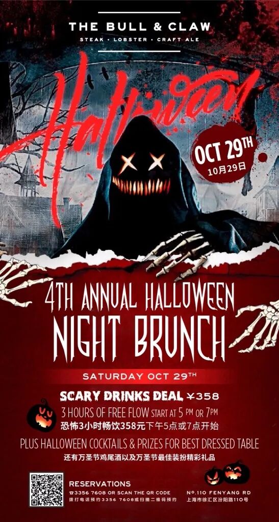 The Bull & Claw's 4th Annual Halloween Night Brunch sees a spooky menu and the option of three hours of premium free flow for RMB358, which you can start from 5pm or 7pm. Gather up your friends, get creative and come up with the best costumes, and you could also walk away with the group prize for the best dressed table! Sat Oct 29, from 5pm. The Bull & Claw110 Fenyang Lu, by Fuxing Zhong 汾阳路110号, 近复兴中路.