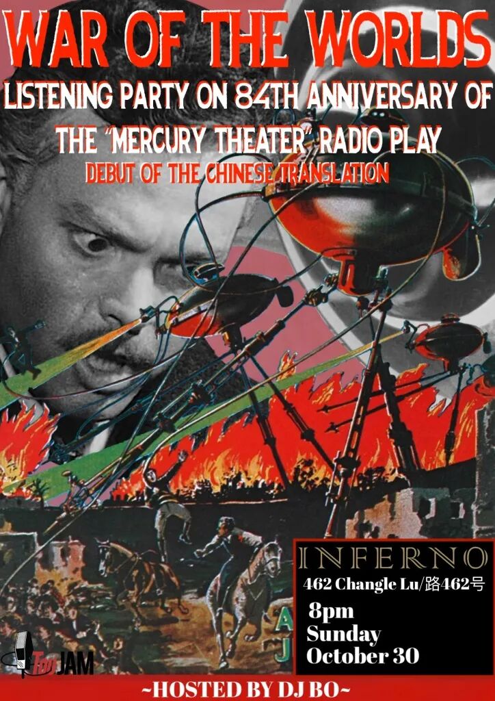 On the night of October 30, 1938, Orson Welles and his Mercury Theater On The Air invaded the airwaves with a tale of paranoia, violence and existential dread that captivated audiences like few other broadcasts in American media history. It told a tale from the previous century, HG Wells's War of the Worlds, but cleverly adapted its setting and story to fit the contemporaneous audience. It's aided by the voice work of Welles himself (two years before he became the filmmaker of CitizenKane and other classics) as well as music from Bernard Herrmann (future composer of similarly classic themes for Psycho and The Twilight Zone), and perhaps especially by an audience on edge from being in an unsettling time. Eighty-four years to the date, and with all three of those elements just as alive today as ever, this Sunday, October 30 at Shanghai metal bar Inferno, TouJAM presents a listening party of this audio drama. Beyond that, host DJ BO will present a brief talk about the project, and – for the first time ever – present live a Chinese script adaptation and sample of a recording of the work into Mandarin Chinese. The original, of course, reportedly lead to listeners to run into the streets, panicked beyond belief. Will it still have the same effect? Find out yourself, this Sunday, Halloween eve, at Inferno. Oh, and it is free entrance! Sun Oct 30, from 8pm; Free. InfernoUnited Valley, 462 Changle Lu, by Shaanxi Nan Lu 长乐路462号, 近陕西南路.