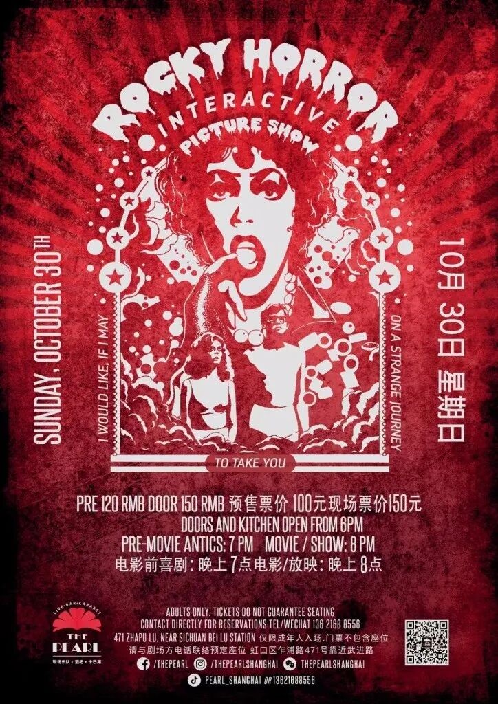 Halloween eve at The Pearl sees a sceening of cult classic The Rocky Horror Picture Show as you've never seen it before, with the theater converted into a laboratory and every guest receiving a prop bag for a truly interactive event full of audience participation. Let's do the time warp again! Scan the QR to get your tickets now: Sun Oct 30, 6pm doors, 7pm antics, 8pm movie/show; RMB120 pre-sale, RMB150 on the door. The Pearl471 Zhapu Lu, by Wujin Lu 乍浦路471号, 近武进路.