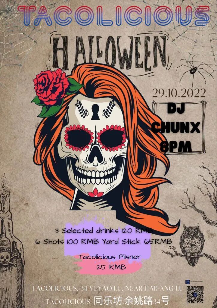 At Tacolicious it's three drinks for RMB120, six shots for RMB100, Yard Stick for RMB65 and Tacolicious Pilsner for RMB25, while DJ Chunx hits the decks at 8pm. Sat Oct 29, from 8pm; Free. TacoliciousRoom 104-105, 34 Yuyao Lu, by Xikang Lu 余姚路34号1幢104-105室, 近西康路.