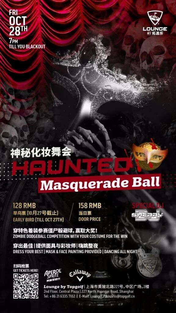 Dress your creepiest costume and join Halloween Haunted Masquerade Ball at Lounge by Topgolf! Win a zombie dodgeball competition and dance till you black out on Friday night. Fri Oct 28, 7pm till you blackout; RMB128 early bird (Oct 27), RMB158 on the door. Lounge by Topgolf2/F, Central Plaza, 227 Huangpi Bei Lu, by Nanjing Xi Lu 黄陂北路227号中区广场2楼,近南京西路.