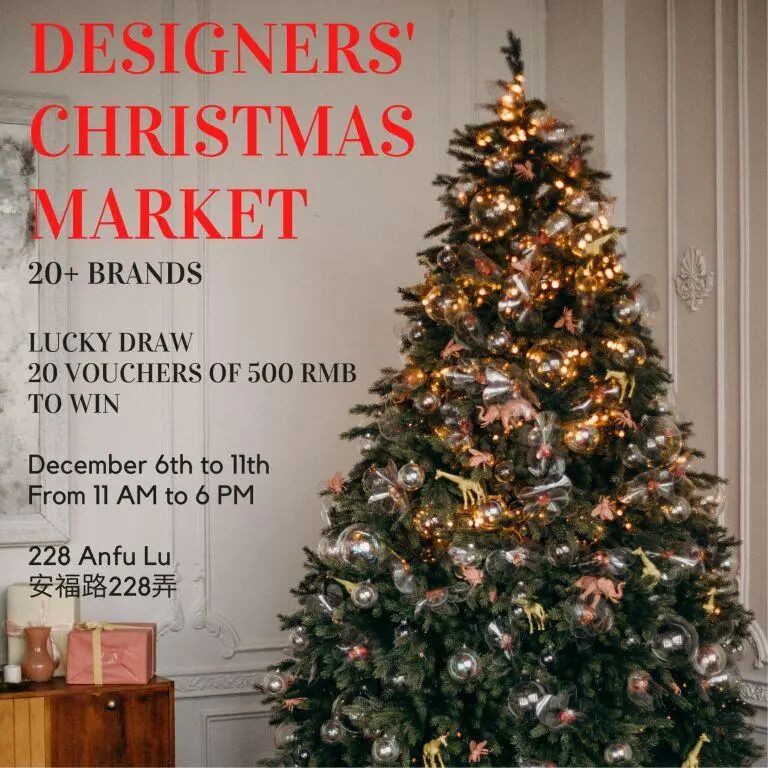 Designers’ Christmas MarketThree designers’ studios on Anfu lu (Attic228, CAPSULE by JULIETTE & MUMU and The Marketplace) are organizing a Christmas market along with 20 other brands. Apparels, bags, cosmetic, home and living, jewels, photos, toys. There will be a large choice of gifts ideas for every member of the family, plus 20 vouchers of RMB500 to be won.