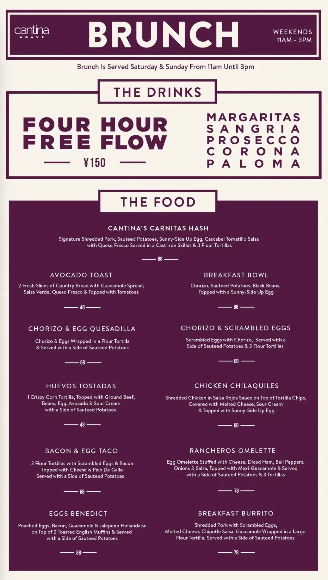 Every Saturday and Sunday, order and item from the Abbey Road brunch menu and add three hours free flow Americano and Soft Drinks for RMB58, or three hours free flow Prosecco, House Wine, Mimosa, Bloody Mary, Carlsberg Draft, Gin Tonic, Aperol Spritz and Sangria for RMB168. Abbey Road 3 Taojiang Lu, by Fenyang Lu 桃江路3号, 近汾阳路.Cantina Agave