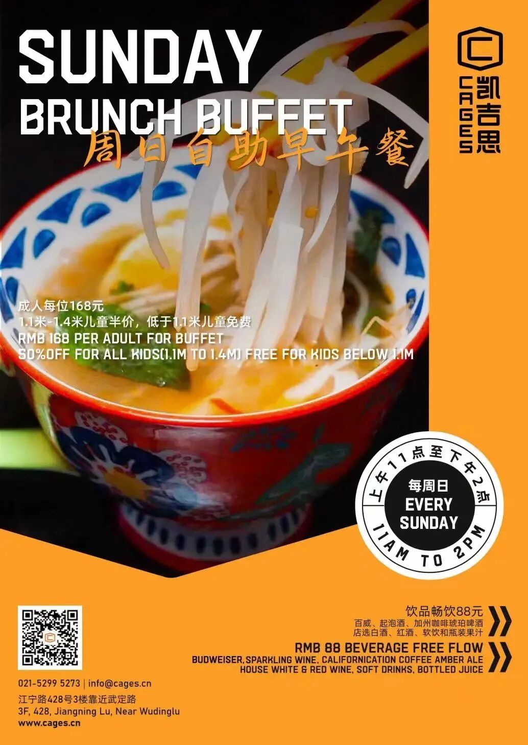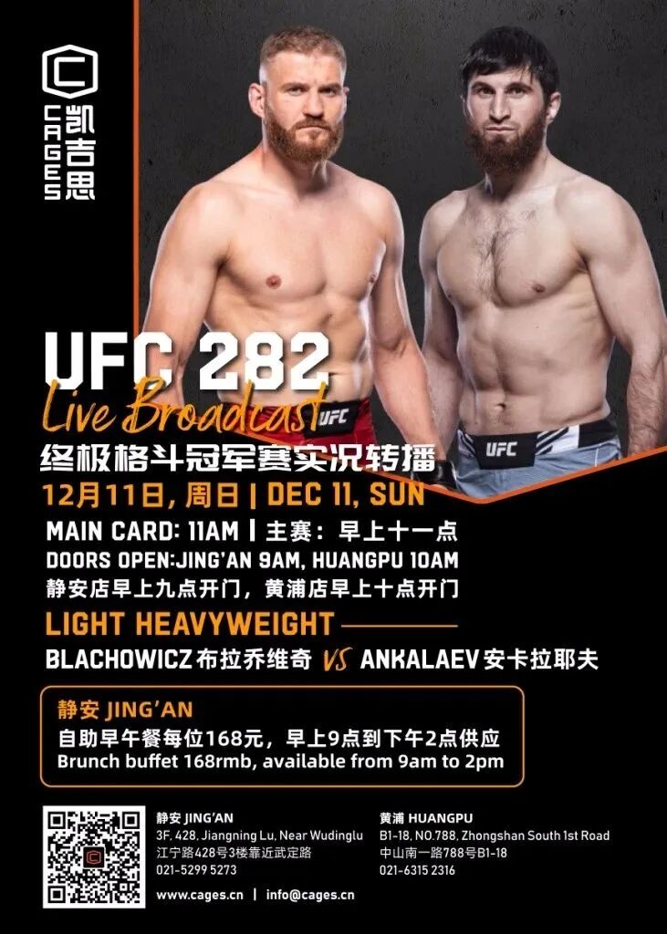 Every Sunday from 11am to 2pm (but from 9am this weekend, see below), Cages offers a global feast not to be missed. From an Asian Noodle bar to Cheese McMuffins to Breakfast Burritos, enjoy over 30 dishes from around the world.The brunch deal is just RMB168 per adult, while kids below 1.4 meters enjoy 50% off and below 1.1 meters eat for free. And get your booze on with free flow for just RMB88!As well as numerous big screens ideal for sports fans, Cages is also the perfect place for families, with its myriad of entertainment options designed for hours of fun for all ages.This weekend it all kicks off from 9am as they will be screening UFC 282 live.Cages Jing'an3/F, Jing'an Sports Center, 428 Jiangning Lu, by Wuding Lu 江宁路428号静安体育中心3楼, 近武定路.Looking for More?