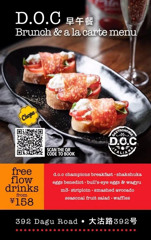 Brunch Tacos, Quesadillas and Burritos go from RMB40, while free flow Beer, Mexican Mules and Frozen Margaritas will set you back just RMB150 from 12-3pm every weekend at Tacolicious.Brunch Sat & Sun, 12-3pm.TacoliciousRoom 104-105, 34 Yuyao Lu, by Xikang Lu 余姚路34号1幢104-105室, 近西康路.D.O.C. Gastronomia Italiana